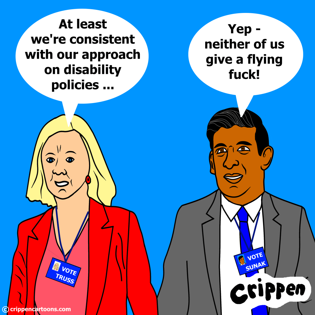 Caricatures of Liz Truss and Rishi Sunak are standing side by side. They each have a ‘vote for me’ label attached to a lanyard around their necks. Truss is saying: “At least we’re consistent with our approach on disability issues …” Whilst Sunak replies: “Yep – neither of us give a flying fuck!”