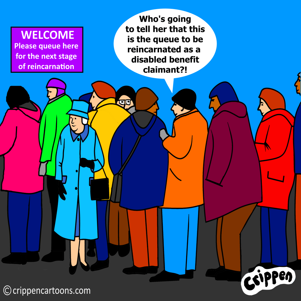 The late Queen is seen standing in a queue of people. She is looking somewhat bemused. On the wall above the queue is a sign that reads ‘Welcome – please queue here for the next stage of reincarnation’. One person in the queue is saying to another: “Who’s going to tell her that this is the queue to be reincarnated as a disabled benefit claimant?!”