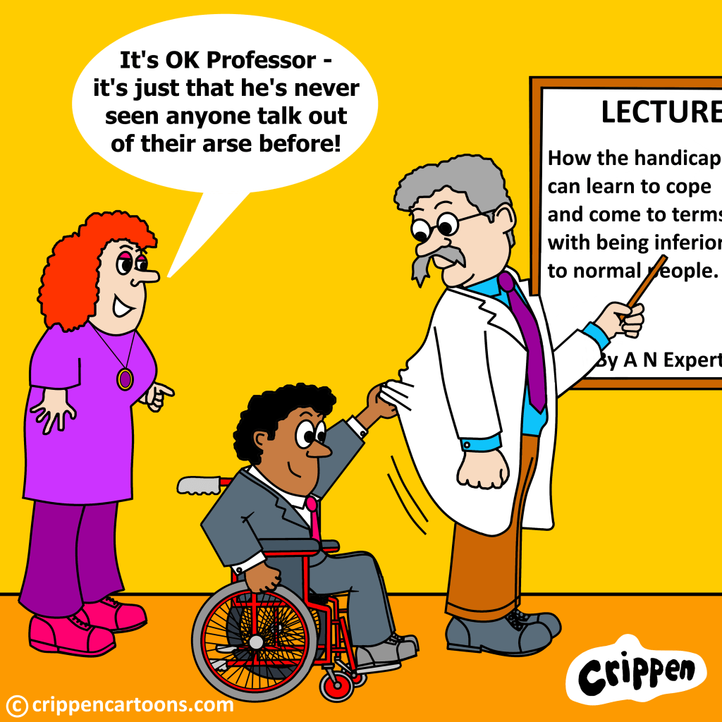 A white male with grey hair and a large grey mustache wearing a white lab coat is pointing at some writing on a white board alongside of him. It reads: Lecture – how the handicapped can learn to cope and come to terms with being inferior to normal people by A N Expert’. A young black male in a self-propelled wheelchair is behind him and has lifted up the lab coat to peer at his bottom. A white female is standing behind the wheelchair user and is saying: “It’s OK Professor – it’s just that he’s never seen anyone talk out of their arse before!”