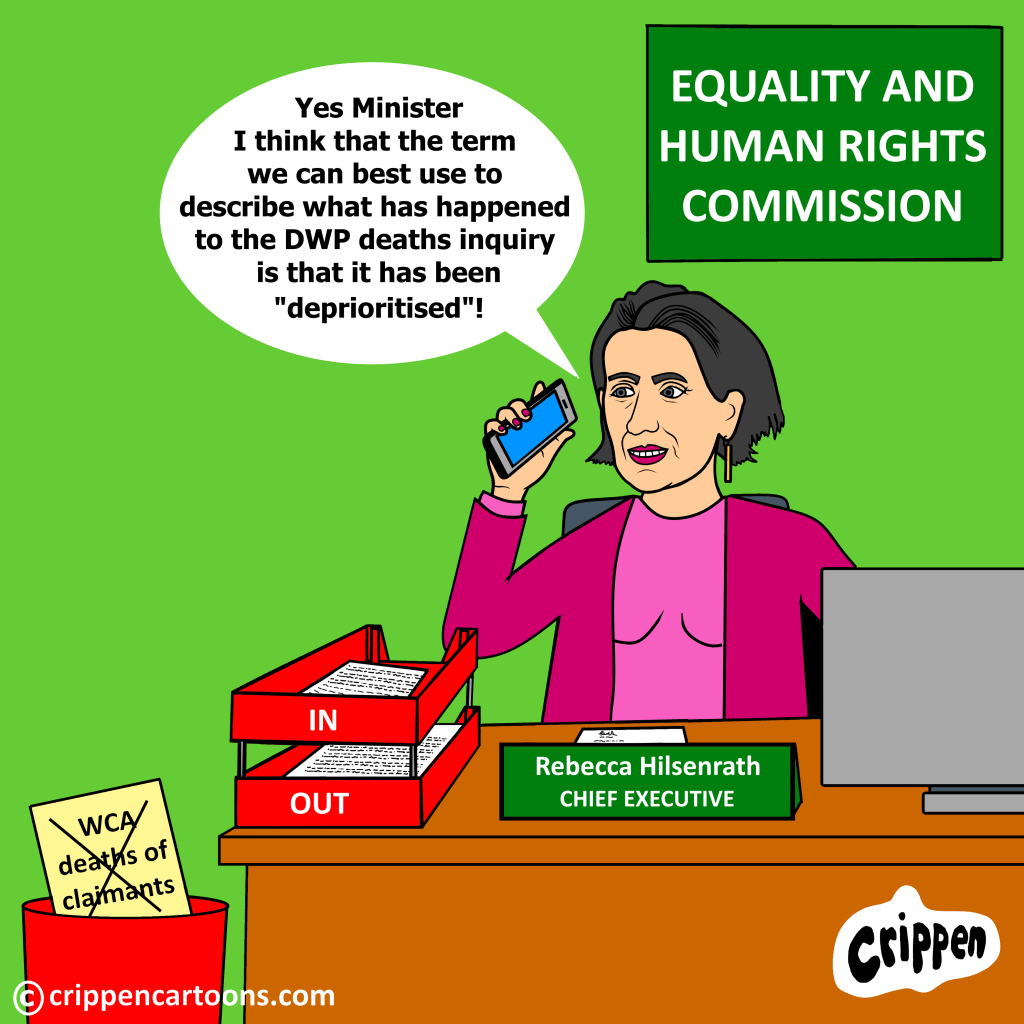 Rebecca Hilsenrath is sat at her desk with a name plate identifying her a being the Chief Executive of the Equality and Human Rights Commission. In a wastepaper bin alongside her desk is a piece of paper with the words ‘WCA deaths of claimants’ crossed out on it. She is holding a mobile phone into which she is saying: “Yes Minister, I think the term we can best use to describe what has happened to the DWP death enquiry is that it’s been deprioritised!”