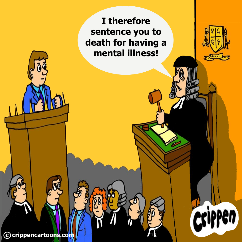 The scene is a high court with solicitors, barristers and members of the public clustered around a tall witness box. In the box is a while male dressed in a blue suit and looking confused. Opposite him is a white male judge, sitting in his own tall box. He is wearing a wig with a black cap perched on the top and is saying: “ I therefore sentence you to death for having a mental illness!”