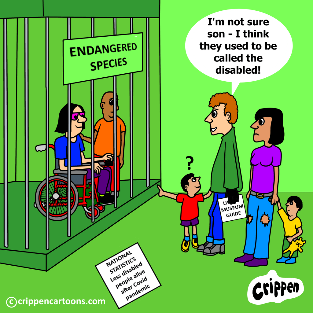 A young family of four are standing outside a cage within which are two disabled people. On the cage is a sign that reads ‘endangered species’. One of the family members is holding a booklet with ‘museum guide’ printed on the front. On the floor is a piece of paper with ‘National Statistics – Less disabled people alive after Covid Pandemic’. One of the children is pointing at the cage with a question mark over his head. His father replies: “I’m not sure son – I think they used to be called the disabled!”