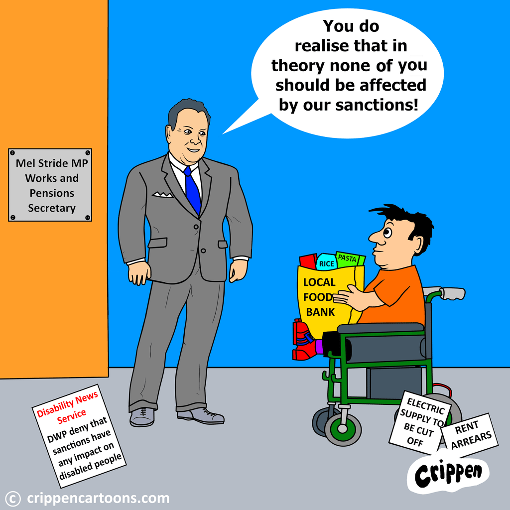 The Work and Pensions Secretary Mel Stride is standing outside a building with his name plaque on the wall. On the floor at his feet is a copy of the Disability News Service with a headline that reads ‘DWP deny that sanctions have any impact on disabled people’. Opposite him is a wheelchair user clutching a large bag with ‘Local Food Bank’ printed upon it. At his feet is a notice that his electricity supply is to be cut off and another that says ‘Rent Arrears’. Stride is saying: “You do realise than in theory none of you should be affected by our sanctions!”