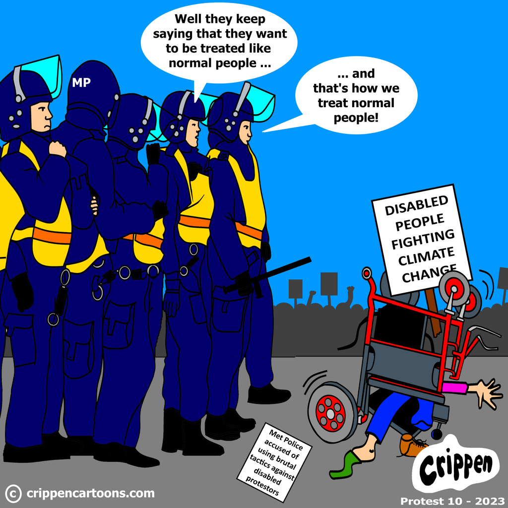 A solid line of metropolitan police officers are attending a climate change protest. They are clad in full riot gear with one of them holding a large baton. In front of them is a power wheelchair which has been smashed up and is upside down on the body of a disabled protester. A large placard in standing up in the wreckage and reads ‘disabled people fighting climate change’. In the background are lots of other protesters waving banners and their clenched fists in the air. One of the police officers is looking down at the wheelchair and is saying: “Well they kept saying that they wanted to be treated like normal people …” another replies: “,,, and that’s how we treat normal people!”