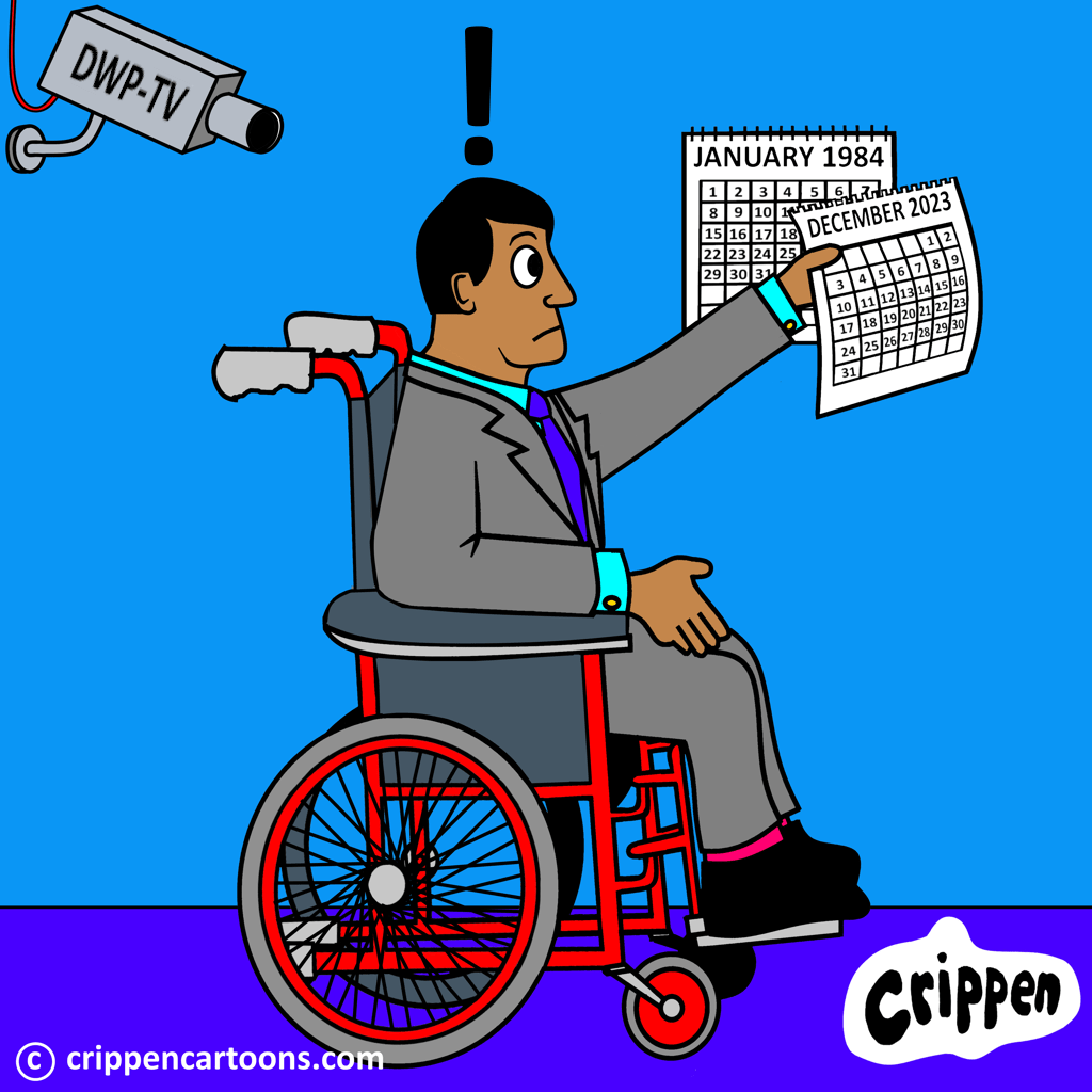 An Asian wheelchair user has reached up to tear away the calendar page for December 2023. However, the new calendar page that is revealed is for January 1984. High on the wall behind him is a CCTV camera with the initials ‘DWP-TV printed on it. A large exclamation mark sits above the disabled person’s head.