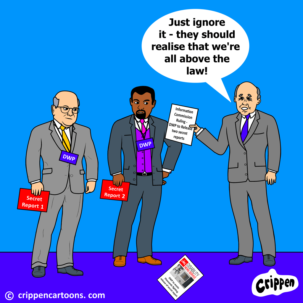 Two suited males from the DWP are standing together with each holding a secret report folder. On the floor is a copy of DNS with the headline ‘DWP to waste thousands fighting release of secret reports’. Opposite them is Iain Duncan Smith who is holding the ruling from the Information Commission. He is saying: “Just ignore it – they should realise that we’re all above the law!”