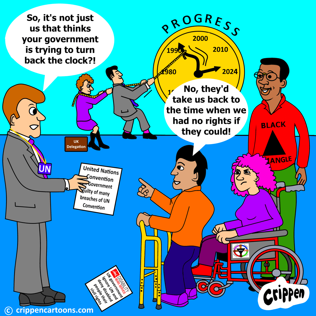 A UN representative is stood talking to a group of disabled people from the UK. In the background are two UK government representatives who are hauling on a rope attached to the arm of a large clock face. The clock face represents ‘progress’ and they are dragging the indicator arm back from 2024. The UN rep is asking the disabled people: “So it’s not just us that thinks that your government is trying to turn back the clock?” One of them replies: “No, they’d take us back to the time when we had no rights if they could!”