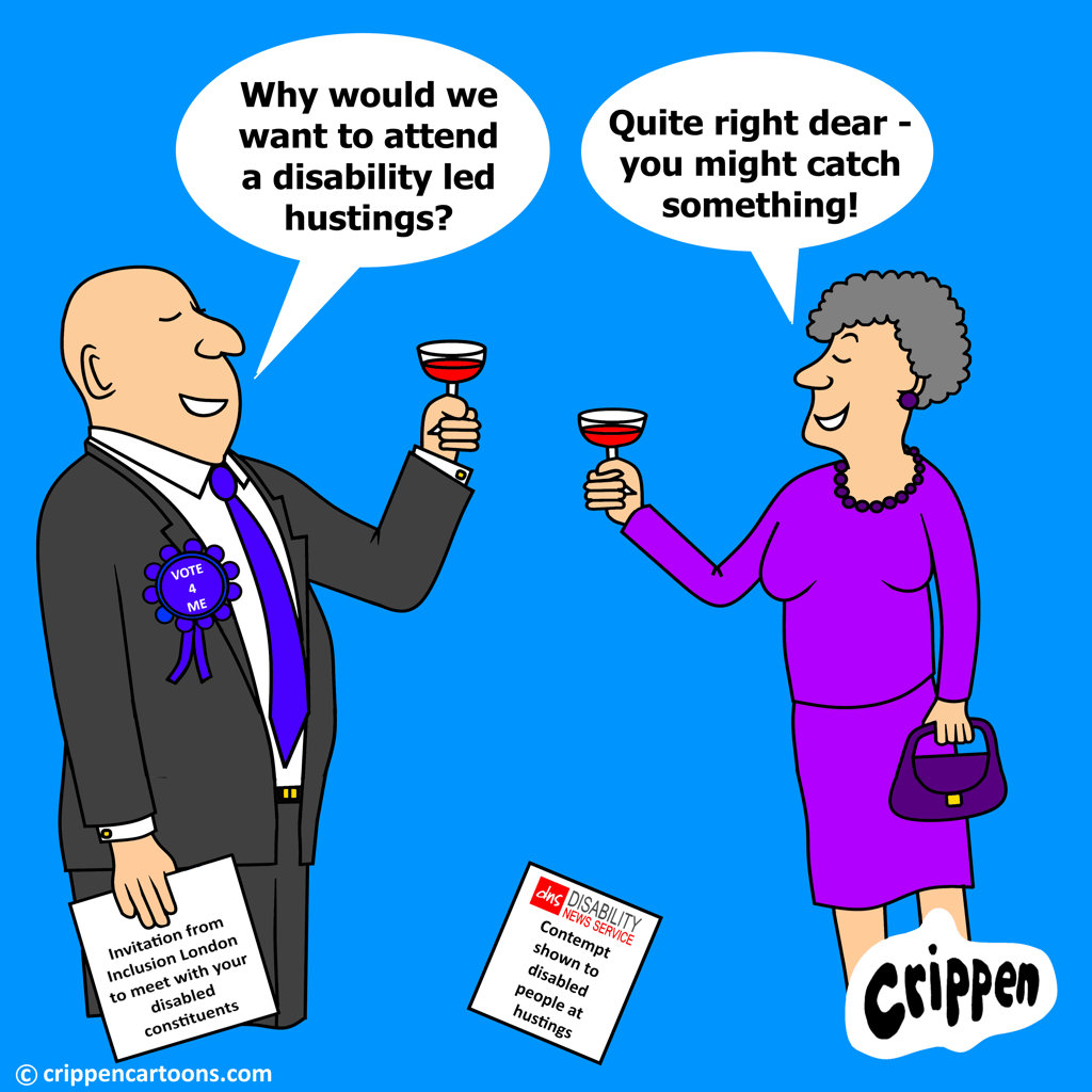 A corpulant white man in a grey suit is standing holding a glass of wine and an invitation from Inclusion London to attend a disability led hustings. He is also sporting a blue rosette with ‘Vote for me’ printed upon it. Opposite him is an older white woman wearing a purple top and dress with matching beads, earings and handbag. She is also holding a glass of wine. The man is saying: “Why would we like to attend a disability led hustings?”. The woman replies: “Quite right dear – you might catch something!”