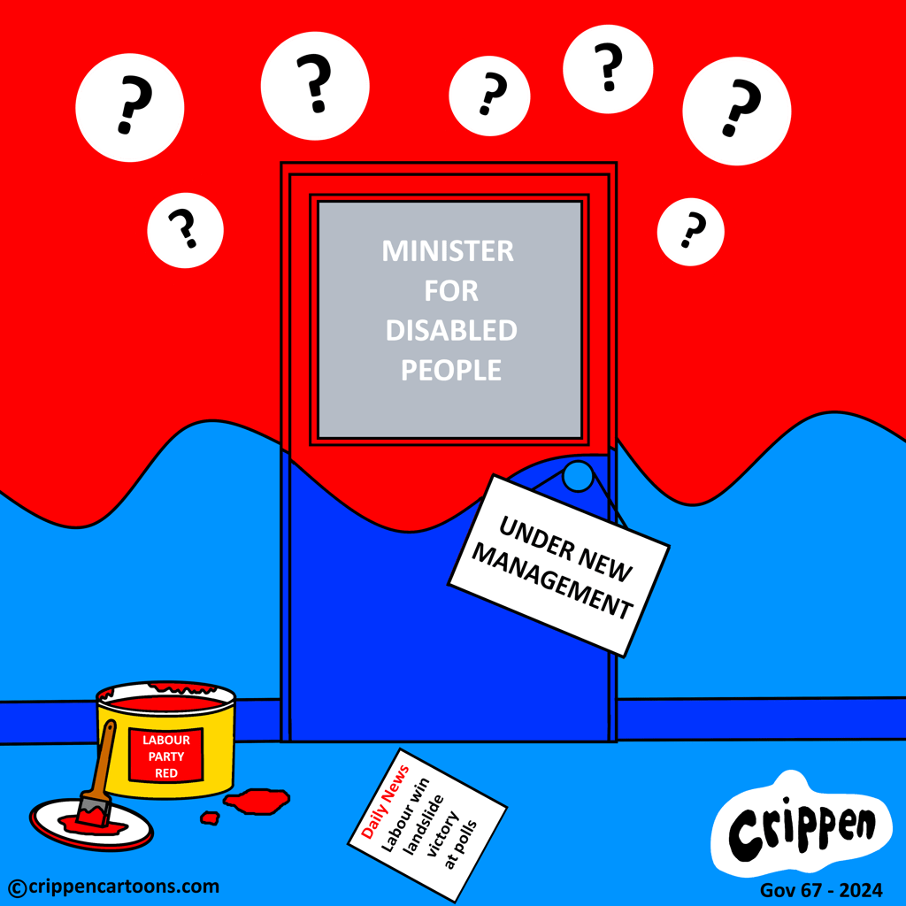 The scene is a corridor with a facing door. The door has a frosted glass top upon which is printed: ‘Minister for Disabled people’. The top half of the wall and the door have been painted Labour red, leaving the bottom half still Tory blue. A paint tin with the label ‘Labour Party Red’ printed upon it, and also a paint brush loaded with red paint is adjacent the door. Hanging on the door handle is also a large sign that reads: ‘Under New Management’. On the floor is a newspaper with the headline ‘Labour win landslide victory!’. The door is surrounded by floating question marks.