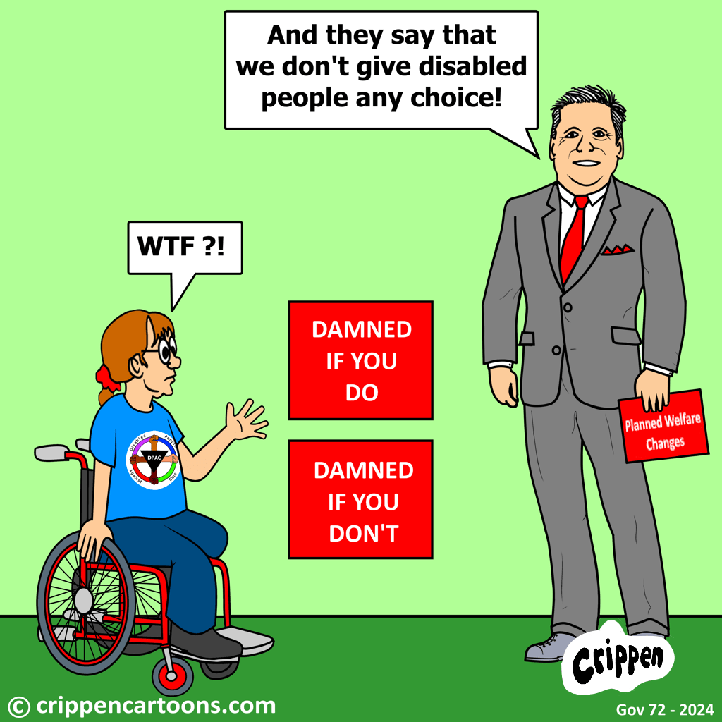 The prime minister is holding a sign that reads ‘Planned Welfare Changes’ and is standing alongside two placards which read ‘Damned if you do’ and ‘Damned if you don’t’. He is saying “And they say that we don’t give disabled people any choice!”. A wheelchair user wearing a Disabled People Against Cuts (DPAC) T-shirt is looking at him with a perplexed expression and is saying “WTF?!”.
