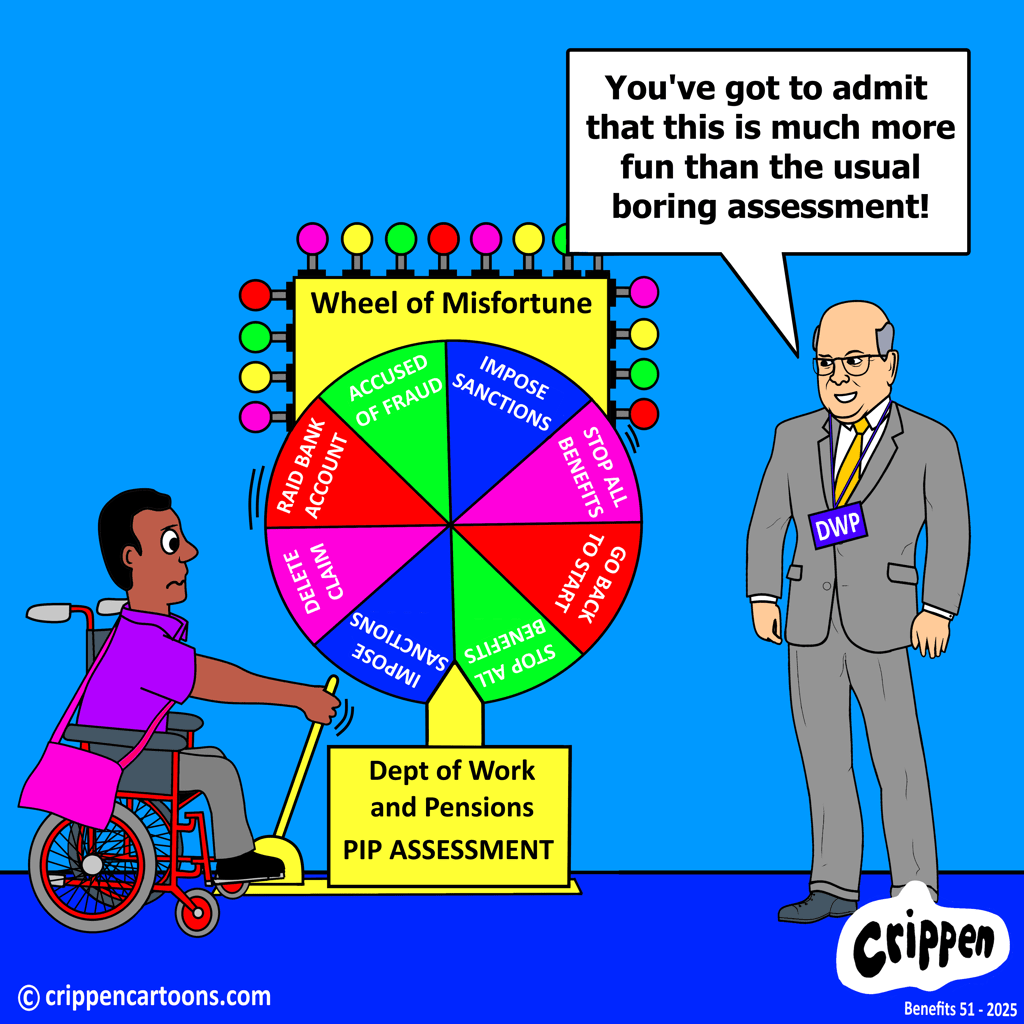 A wheelchair user is sat alongside a giant spinning wheel with rows of flashing lights around it. The face of the wheel has been split into segments which are marked as ‘impose sanctions’, ‘stop all benefits’, ‘go back to start’, ‘accused of fraud’, ‘Raid bank account’ and ‘deleted claim’. The wheel has the name ‘wheel of misfortune – department of work and pensions PIP assessment’ printed upon it. The disabled person is holding a lever which, when pulled, will spin the wheel until it stops with a large pointer aimed at one of the segments. Standing alongside is a man in a grey suit wearing a name tag with DWP printed upon it. He is saying: “You’ve got to admit that this is much more fun than the usual boring assessment!”