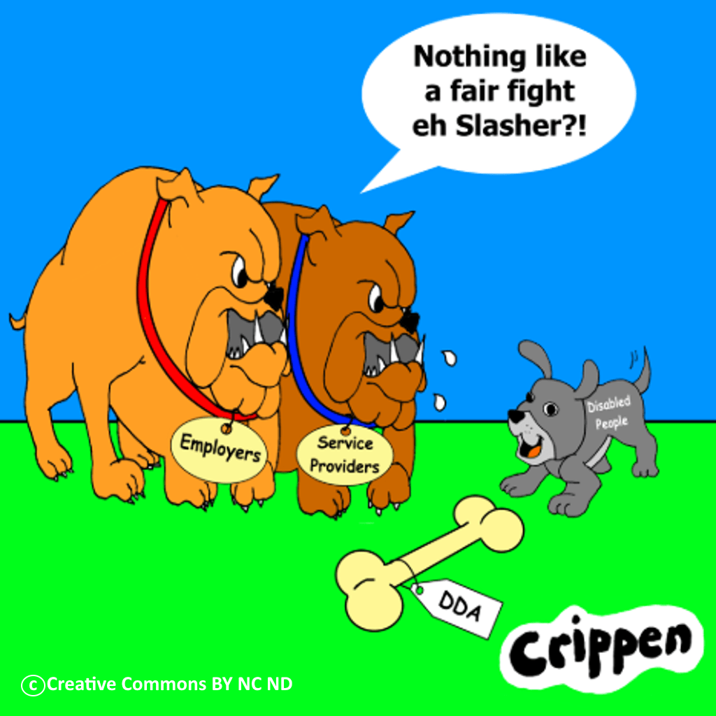 Description of cartoon: Two large, vicious looking dogs are sitting next to a playful puppy. The big dogs are identified as employers and service providers and the puppy is identified as disabled people. A large bone is on the ground between them labelled DDA. One of the big dogs is saying: “Nothing like a fair fight eh Slasher?!”